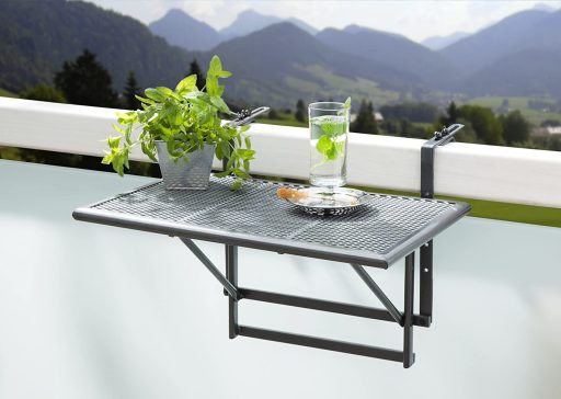 • Mesa colgante es ajustable en altura (4 posiciones);con clavijas de enganche para colocar la mesita en las barandillas del balcón o la terraza; gracias a su reducido peso, se puede montar en la pared